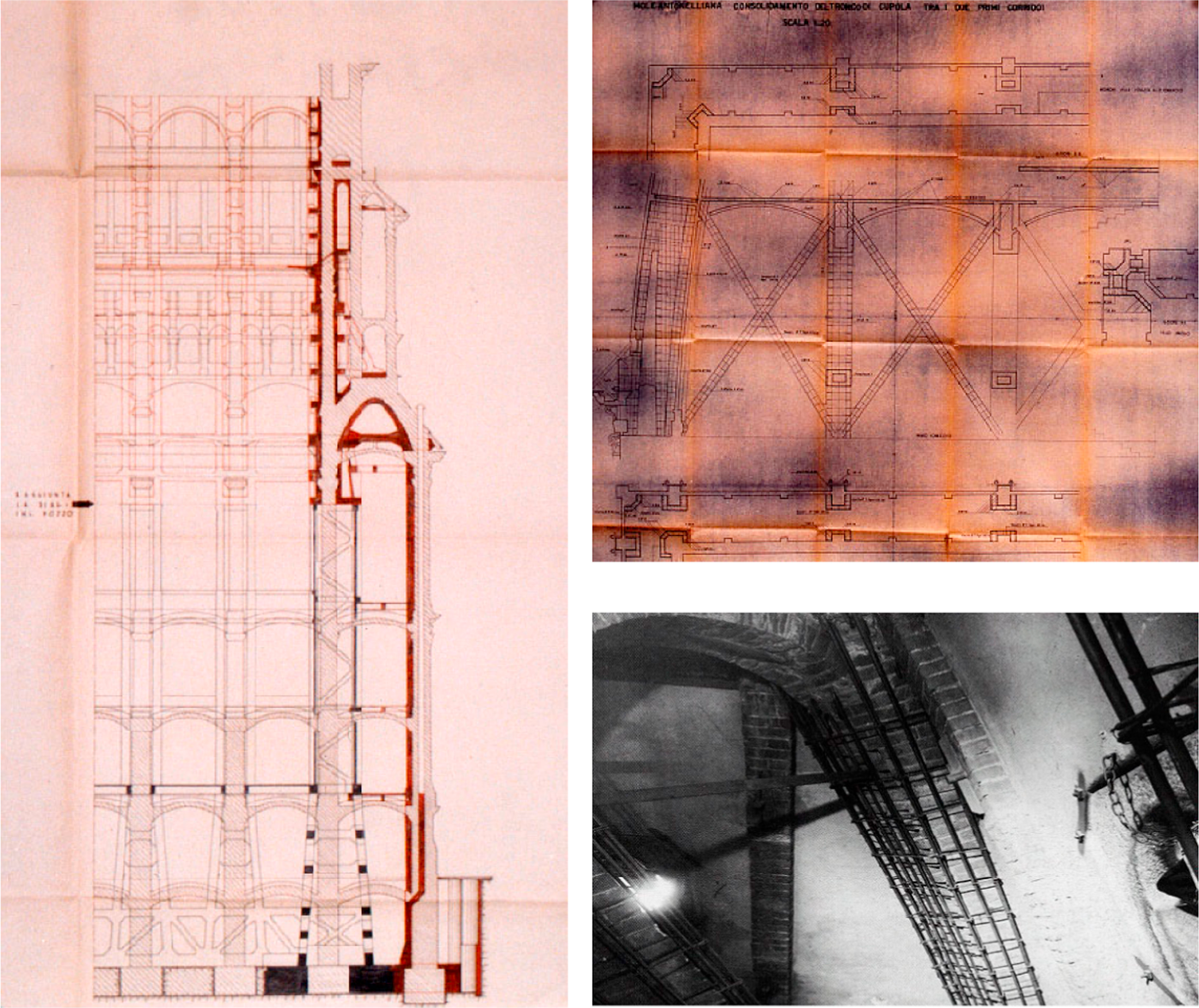 De parabolische bogen aan de basis van de koepel vertoonden scheuren vanaf de vroegste stadia van realisatie van de koepelconstructie. Antonelli startte zelf het herstel hiervan in 1869.