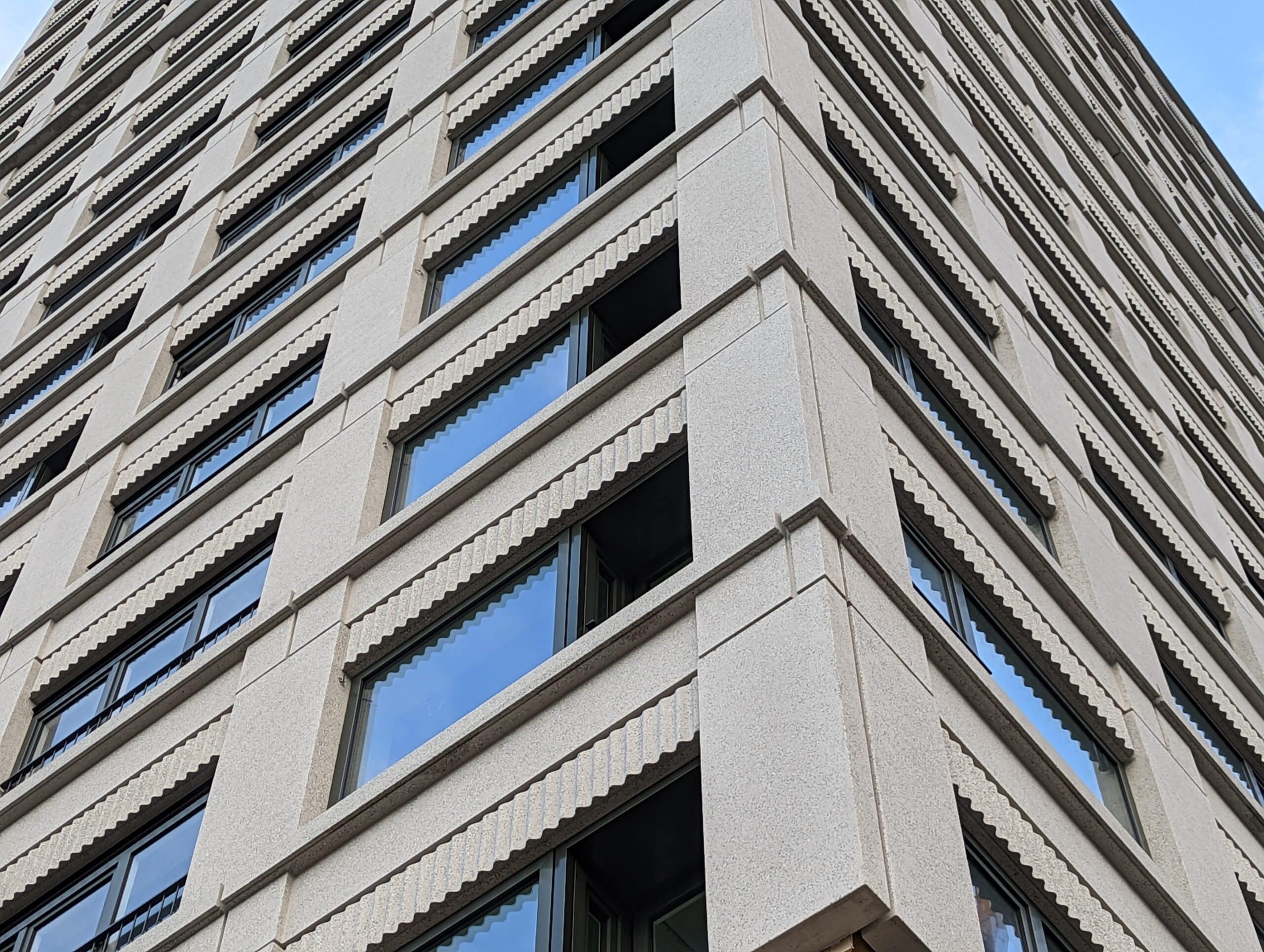 De gevels van de onderste twee bouwlagen konden vanwege hun afwijkende vorm en afwerking niet als sandwichelementen worden uitgevoerd. Het losse binnenblad werd geĆÆntegreerd in de opbouw, terwijl het buitenblad achteraf werd gemonteerd.